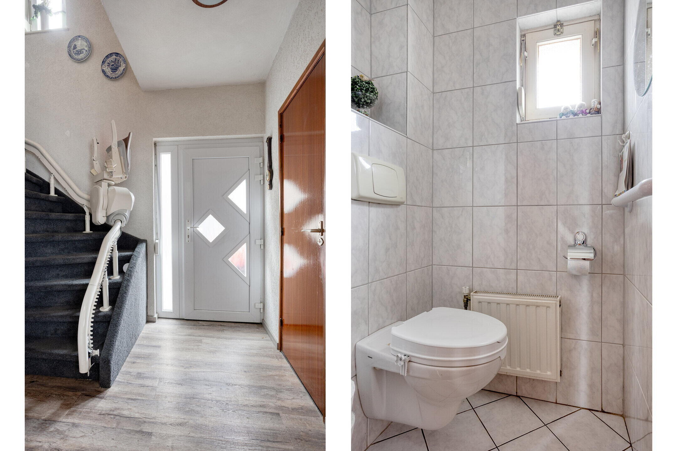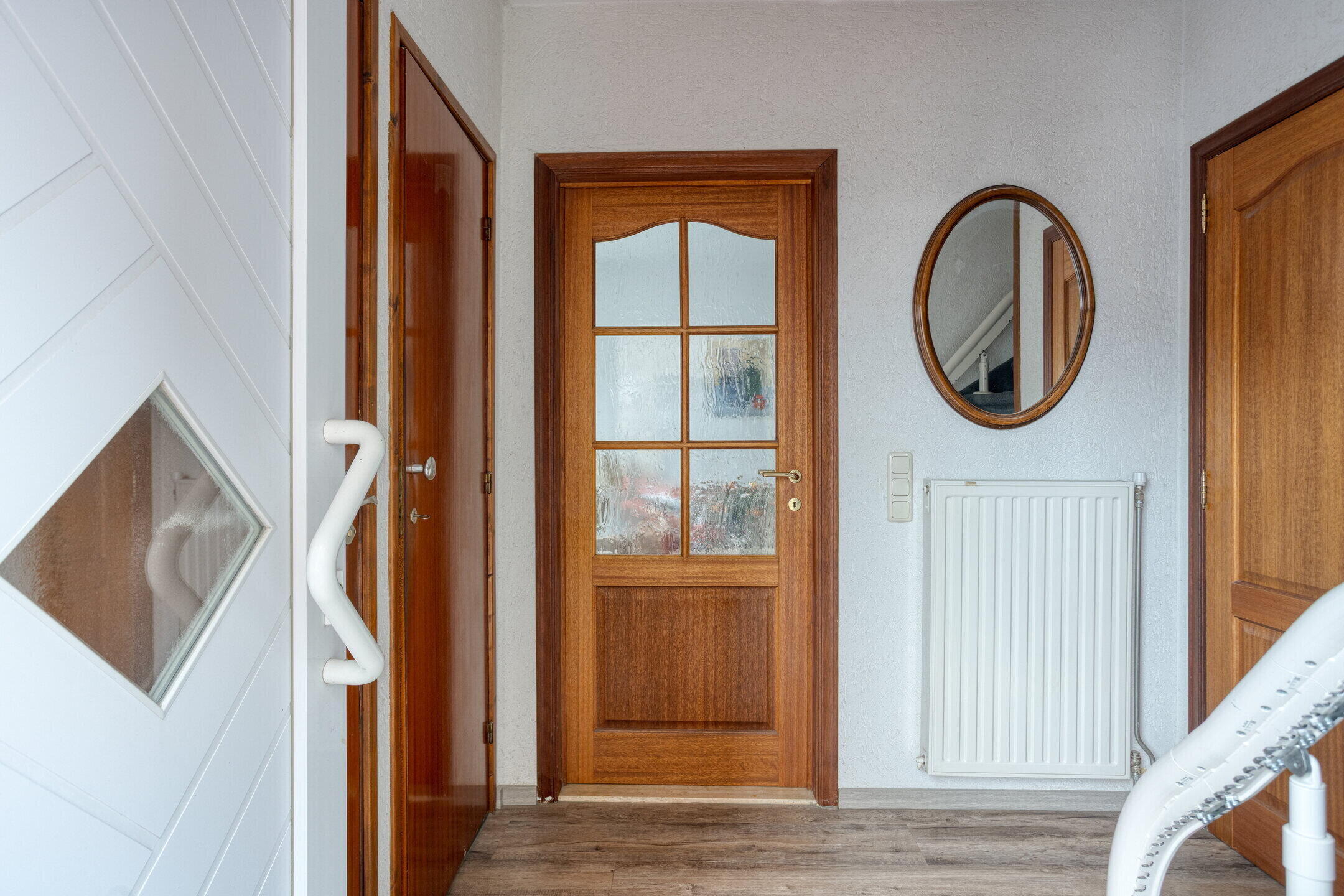 - Entree/hal (ca. 6 m²), voorzien van laminaatvloer, met toegang tot de toiletruimte, garderobekast met meterkast, vaste trap naar de verdiepingen en toegang tot de woonkamer en keuken/eetkamer. Volledig betegelde toiletruimte, voorzien van een vrijhangend closet met inbouwreservoir.
