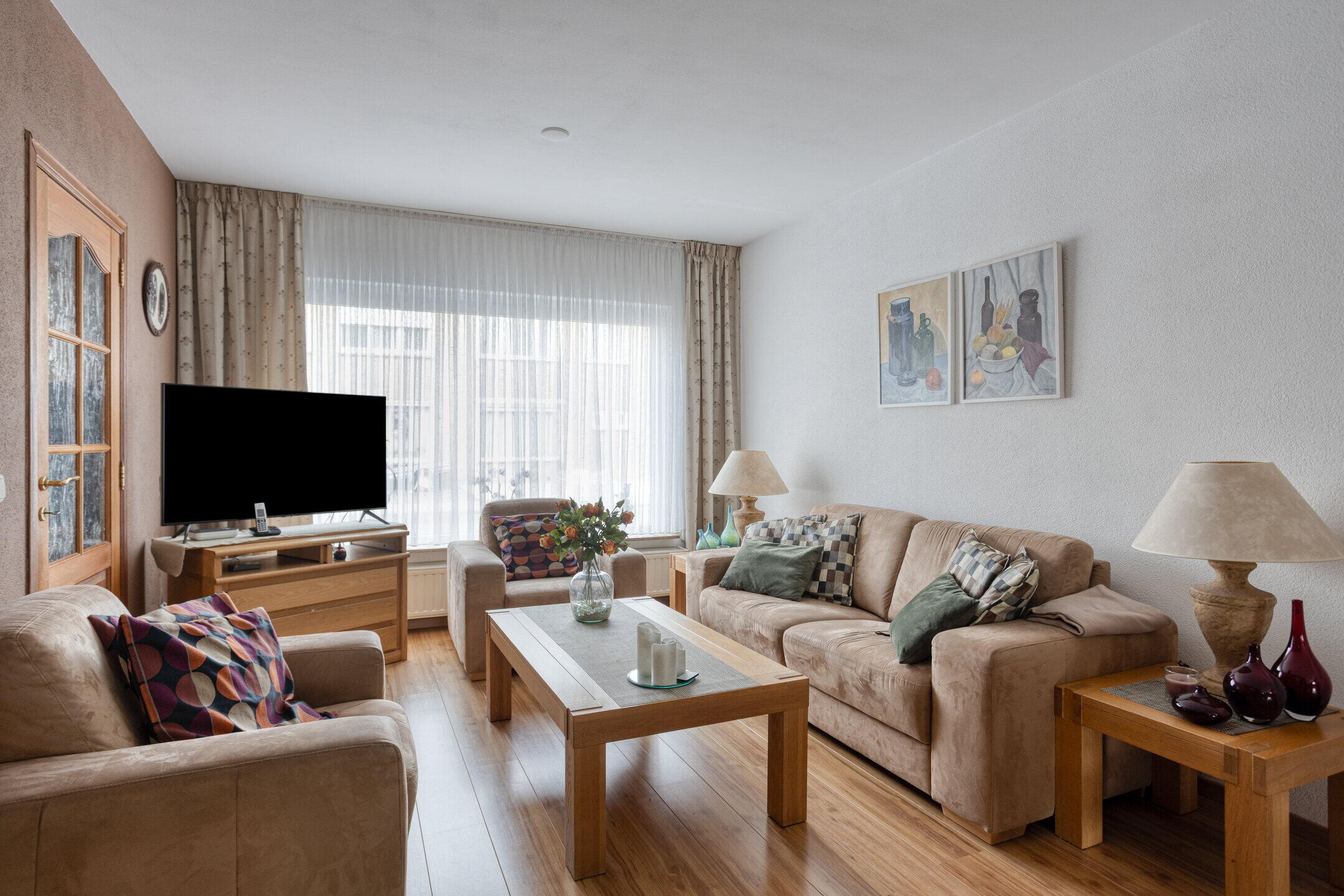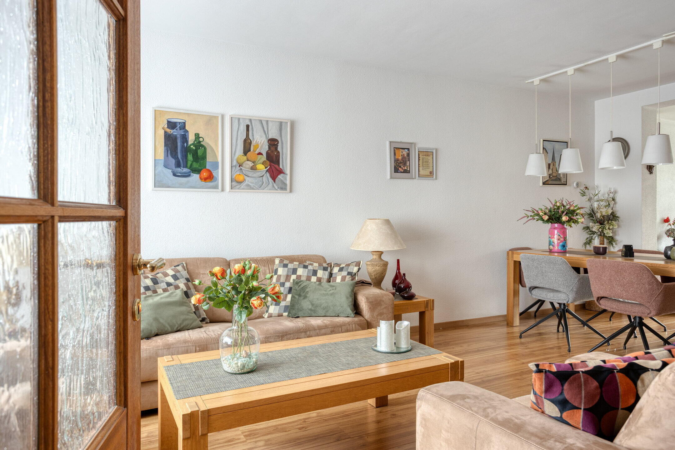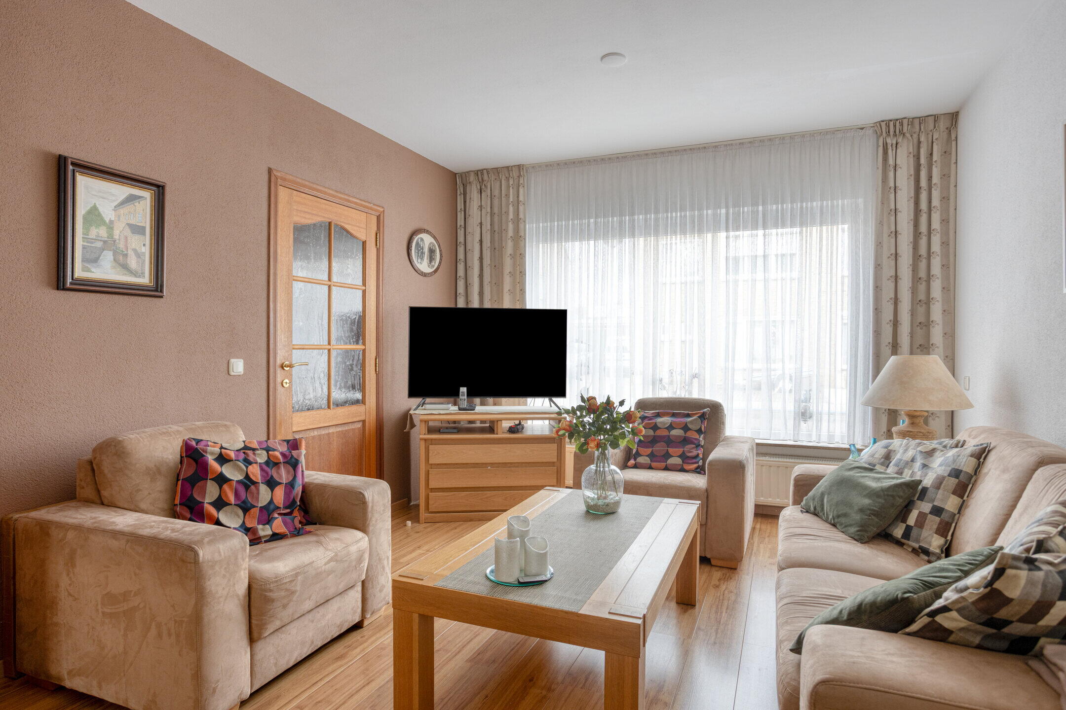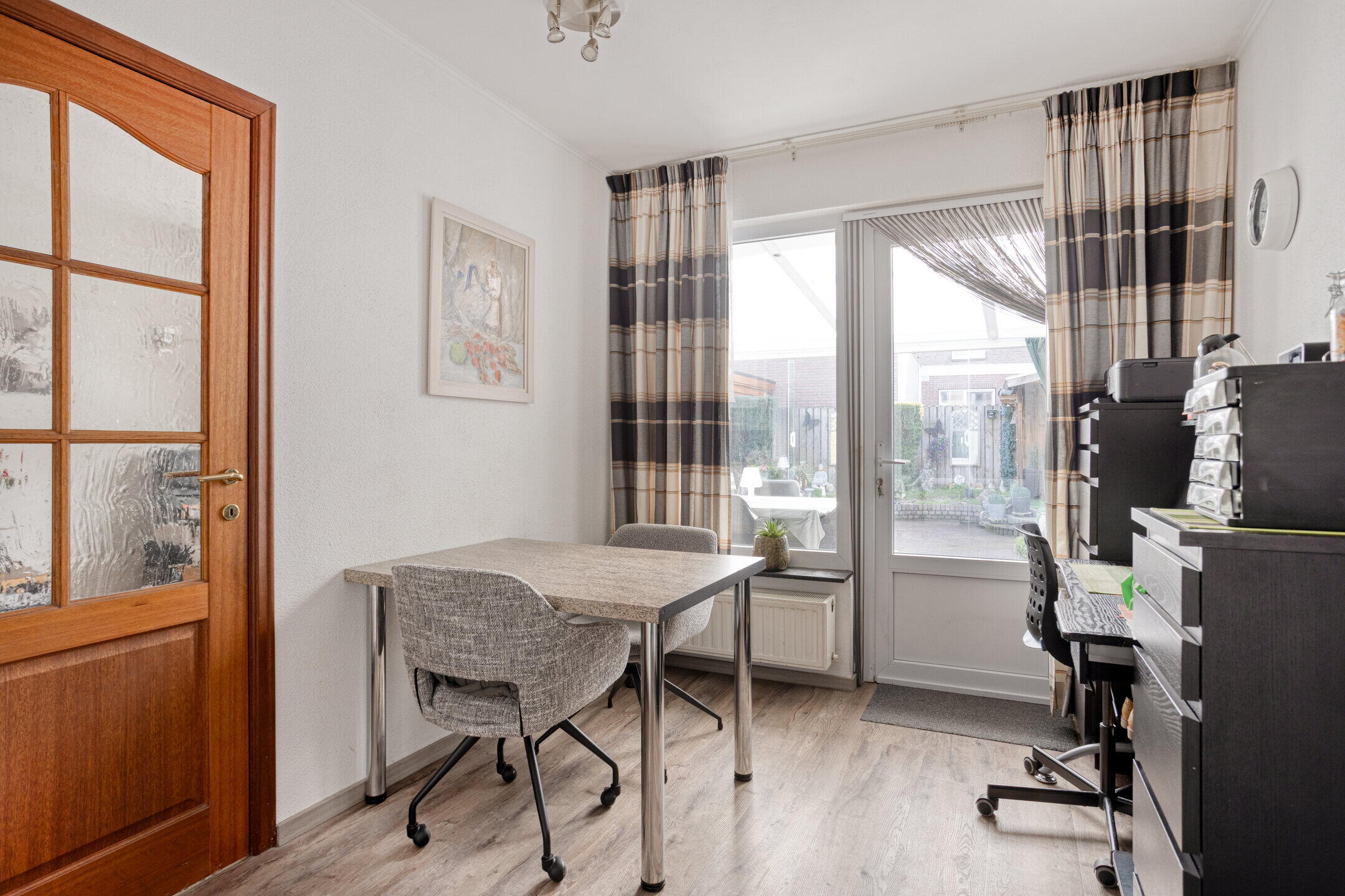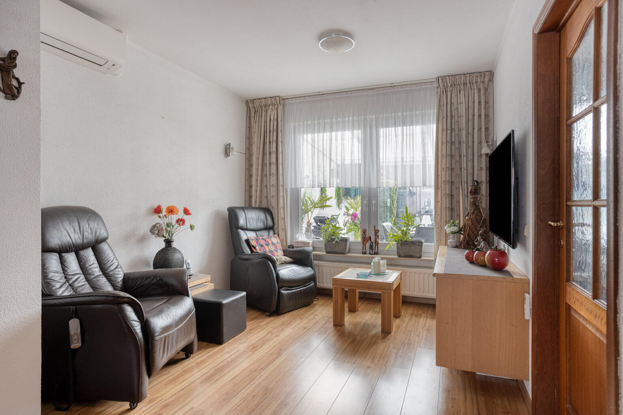 - Heldere woonkamer (ca. 33 m²) met tuinkamer in uitbouw, fijne lichtinval dankzij grote raampartijen aan de voor- en achterzijde, een laminaatvloer en deur naar de keuken/eetkamer. De airco in de woonkamer verhoogt het extra leefcomfort.