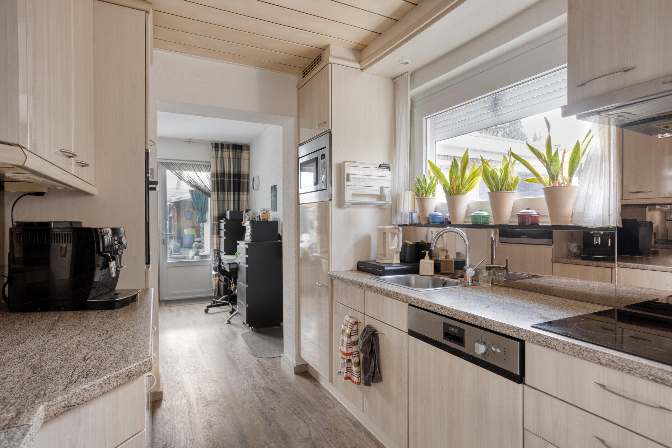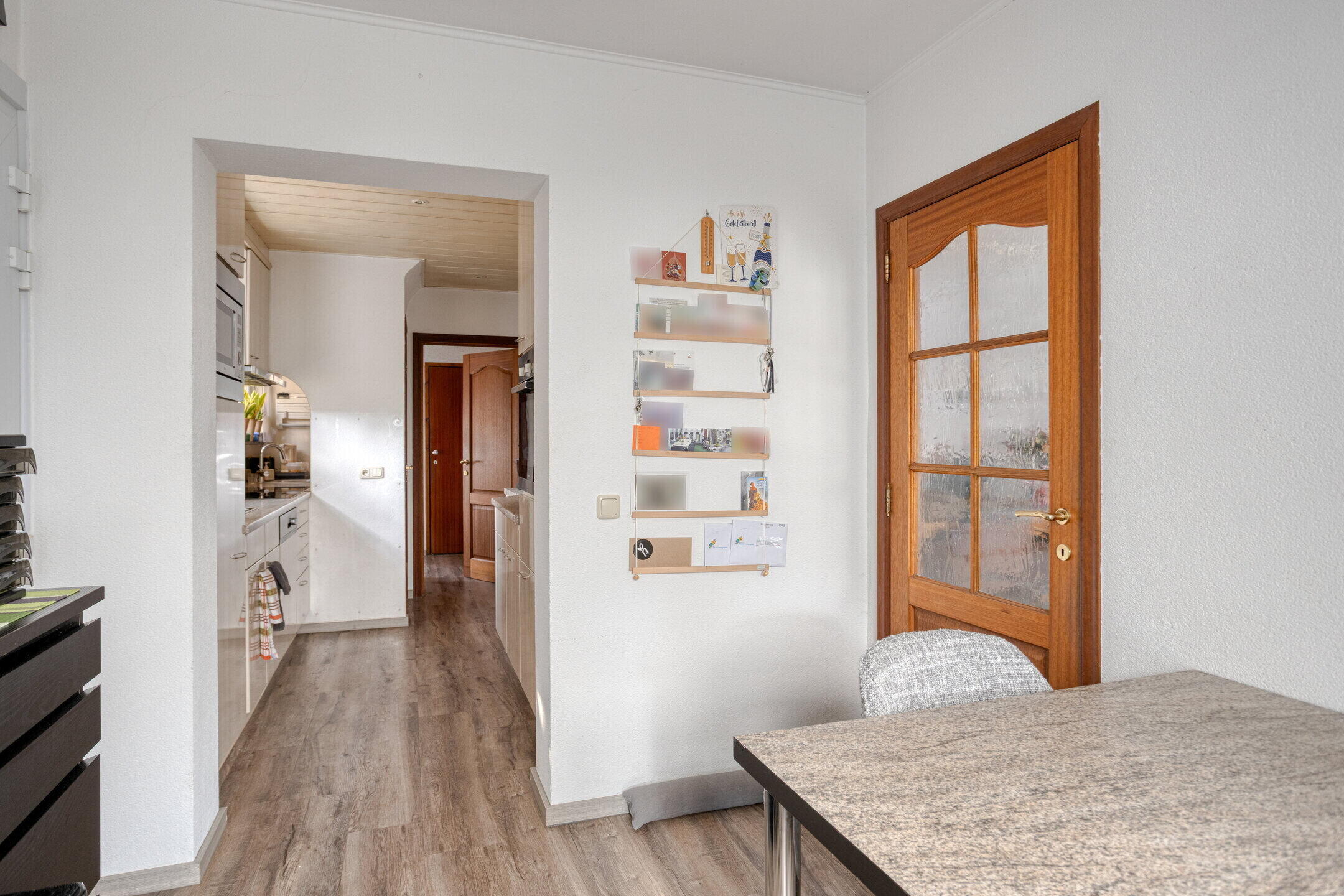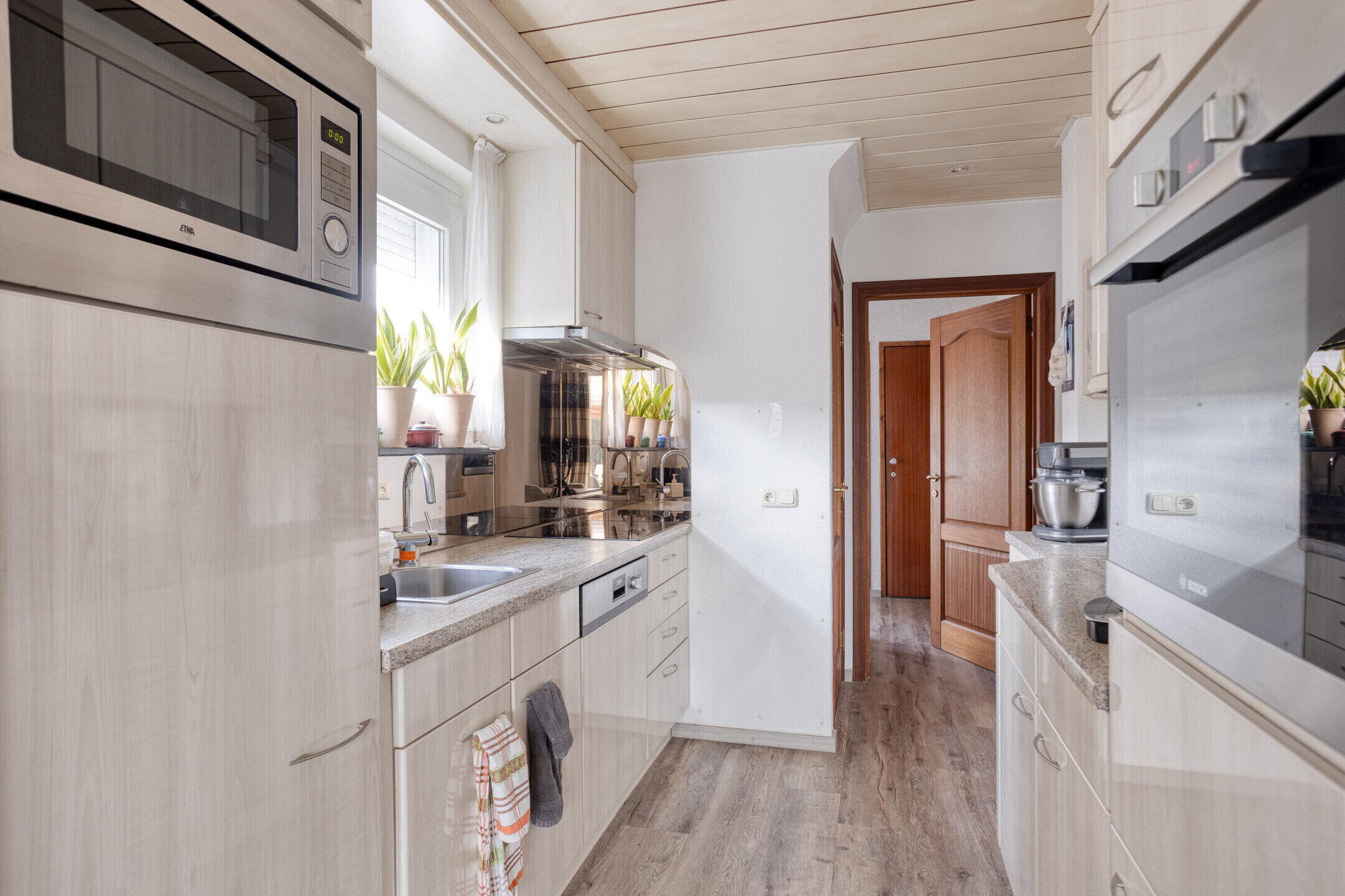 - De keuken/eetkamer (ca. 16 m²) is bereikbaar vanuit de hal en woonkamer, welke is ingericht met een nette, moderne keukenopstelling, voorzien van een kunststof werkblad, 4-pits inductiekookplaat, koelkast, vaatwasser, magnetron en oven. Het raam aan de zijde van de de oprit geeft extra lichtinval en uitzicht. De deur in de keuken biedt toegang tot de kelder. Doorbraak tussen keuken en woonkamer is reeds voorbereid.