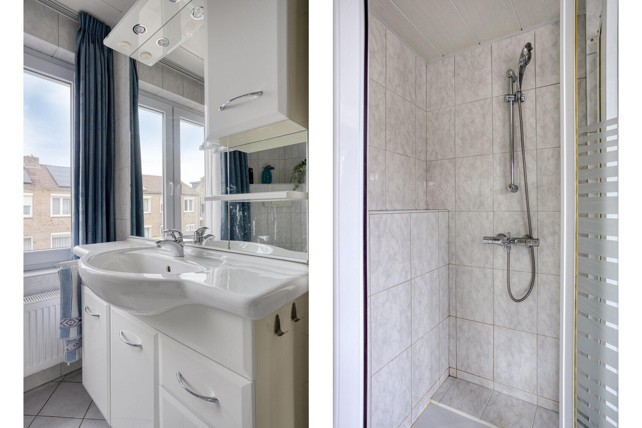 - Goed onderhouden badkamer (ca. 5 m²), welke volledig is betegeld, beschikt over een wastafel in badkamermeubel, douchecabine en een tweede (vrijhangend) toilet met inbouwreservoir.