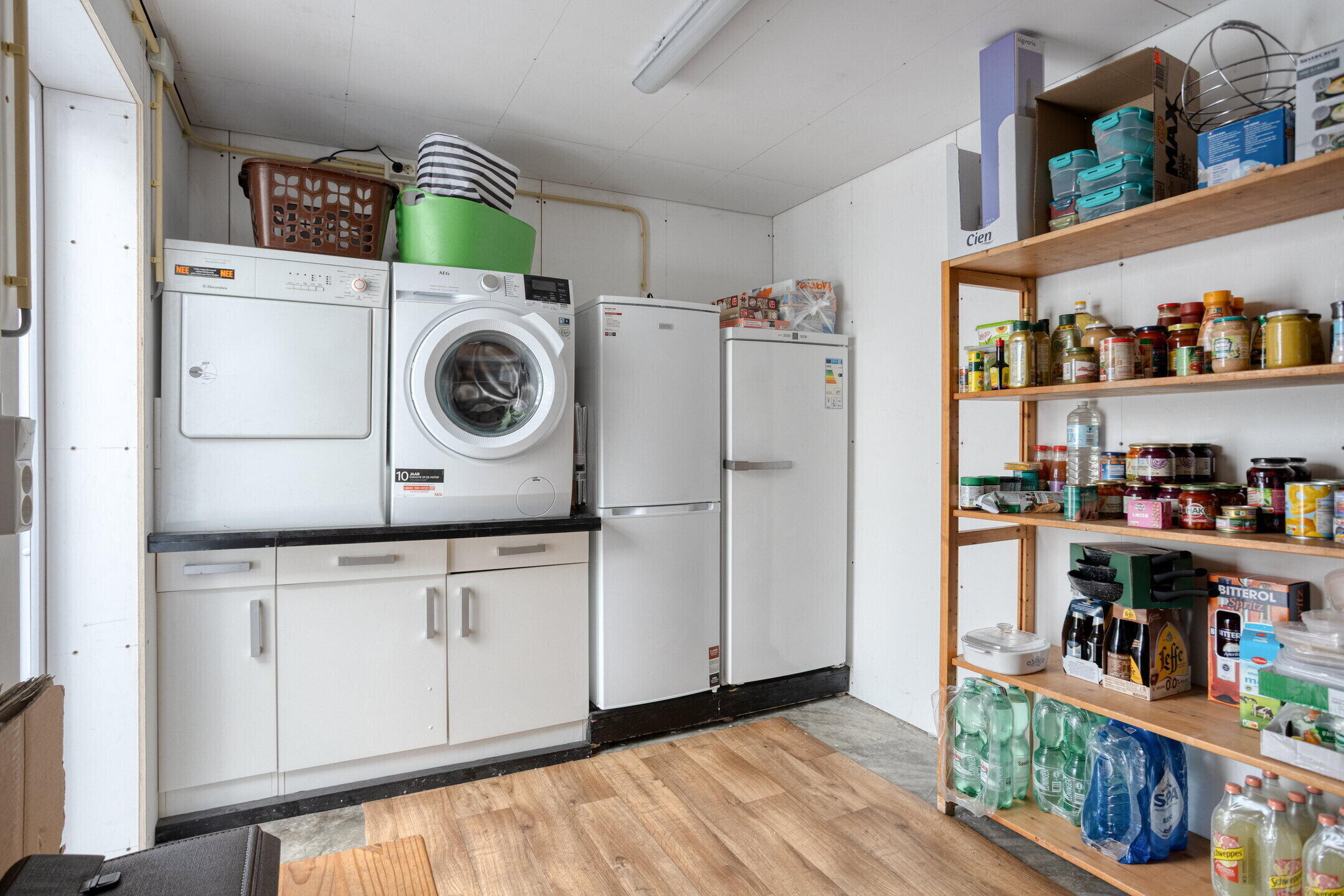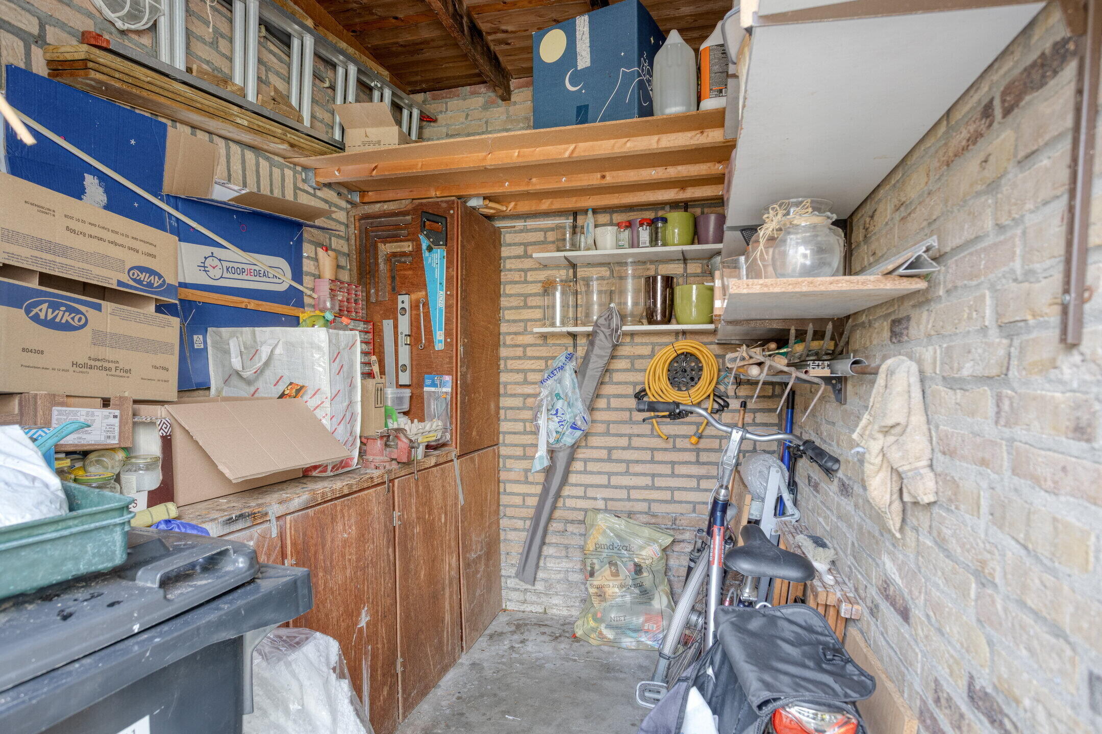 - De tuinkamer/serre biedt tevens toegang tot de voormalige garage, met aan de zijde van de oprit een rolluik, welke de fietsenstalling/berging afsluit. Tussen de fietsenstalling/berging en de geïsoleerde berging/wasruimte, bevindt zich een afsluitbare deur.