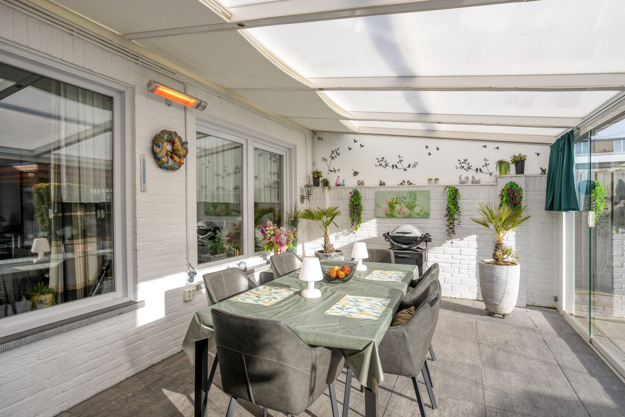- Vanuit de keuken/eetkamer is, middels een loopdeur, de betegelde serre te bereiken welke, mede dankzij de glazen schuifwand en elektrische heater, ook in de koelere periodes een heerlijk plek bieden om te genieten. In de zomer zorgt het zonnescherm voor verkoelende schaduw en met een opengeschoven glaswand, komt er een heerlijk briesje binnen.